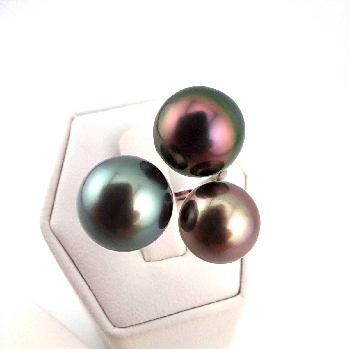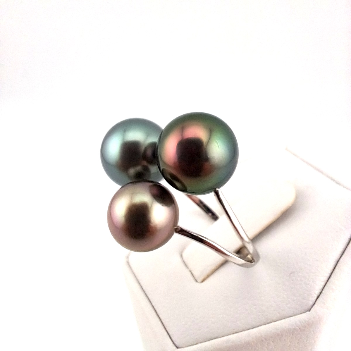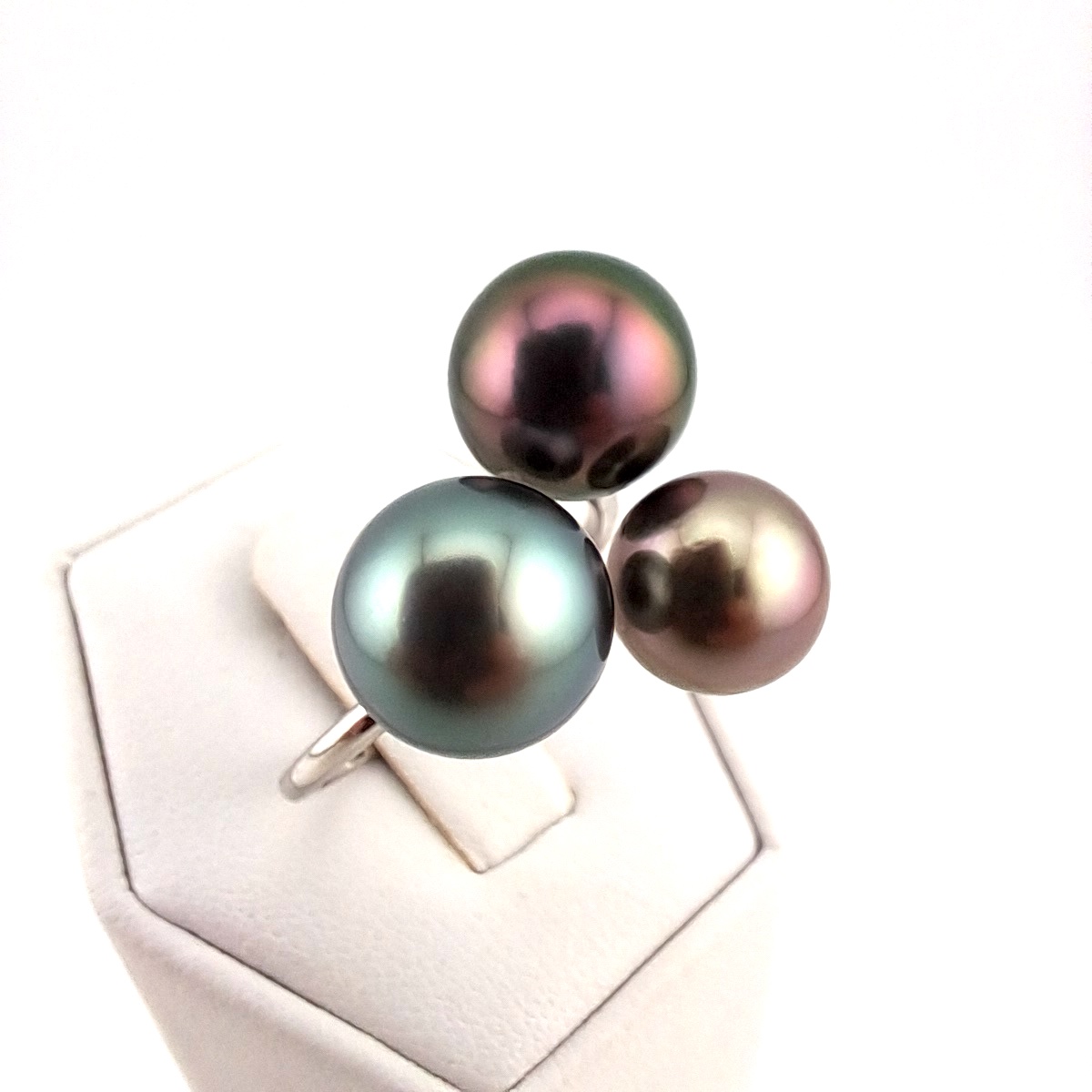 Cette bague met en lumière un trio de perles de Tahiti aux nuances raffinées et complémentaires. Leurs couleurs naturelles, allant du bleu profond à l’aubergine aux reflets verts, jusqu’au champagne rosé délicat, créent un jeu de lumière subtil et captivant. De belle qualité, ces perles séduisent par leur lustre éclatant et leur surface soignée, offrant un bijou à la fois élégant et harmonieux.