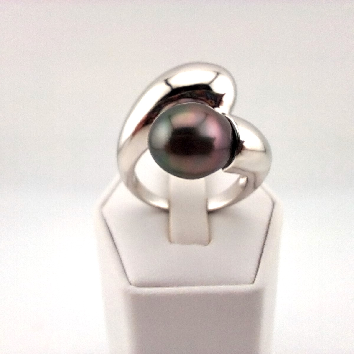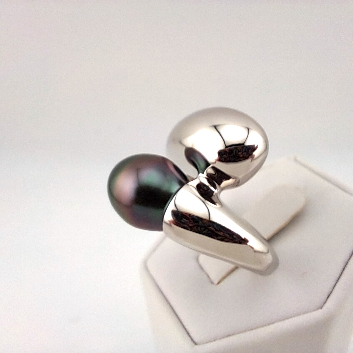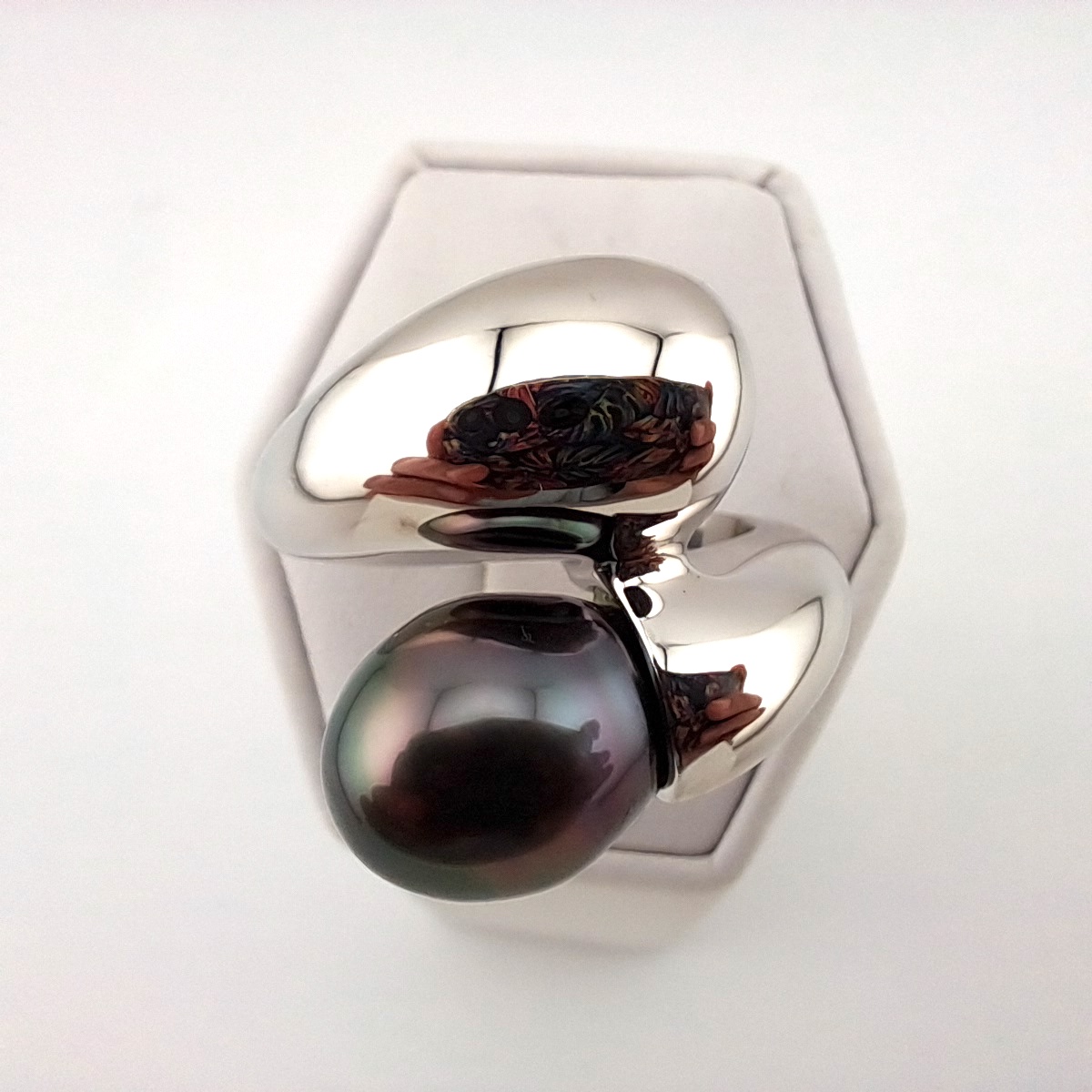 La bague “Lady G.” met en avant une perle de Tahiti exceptionnelle aux nuances vert aubergine, dont les reflets profonds captent la lumière avec sophistication. Sa forme goutte élégante et son lustre lumineux font ressortir la beauté naturelle de la perle, offrant un bijou à la fois raffiné et unique.