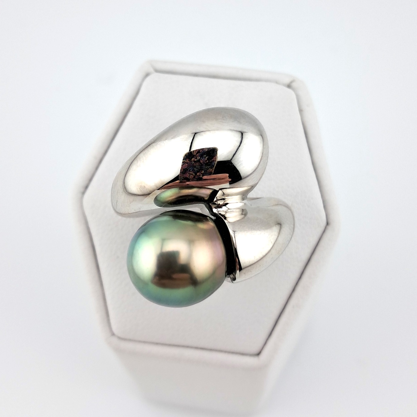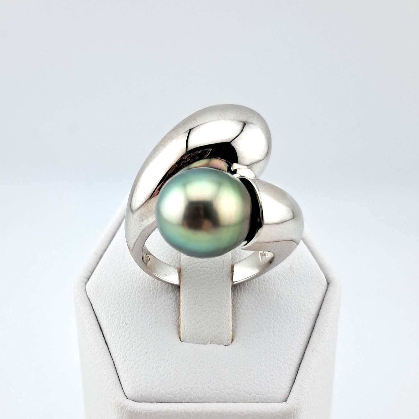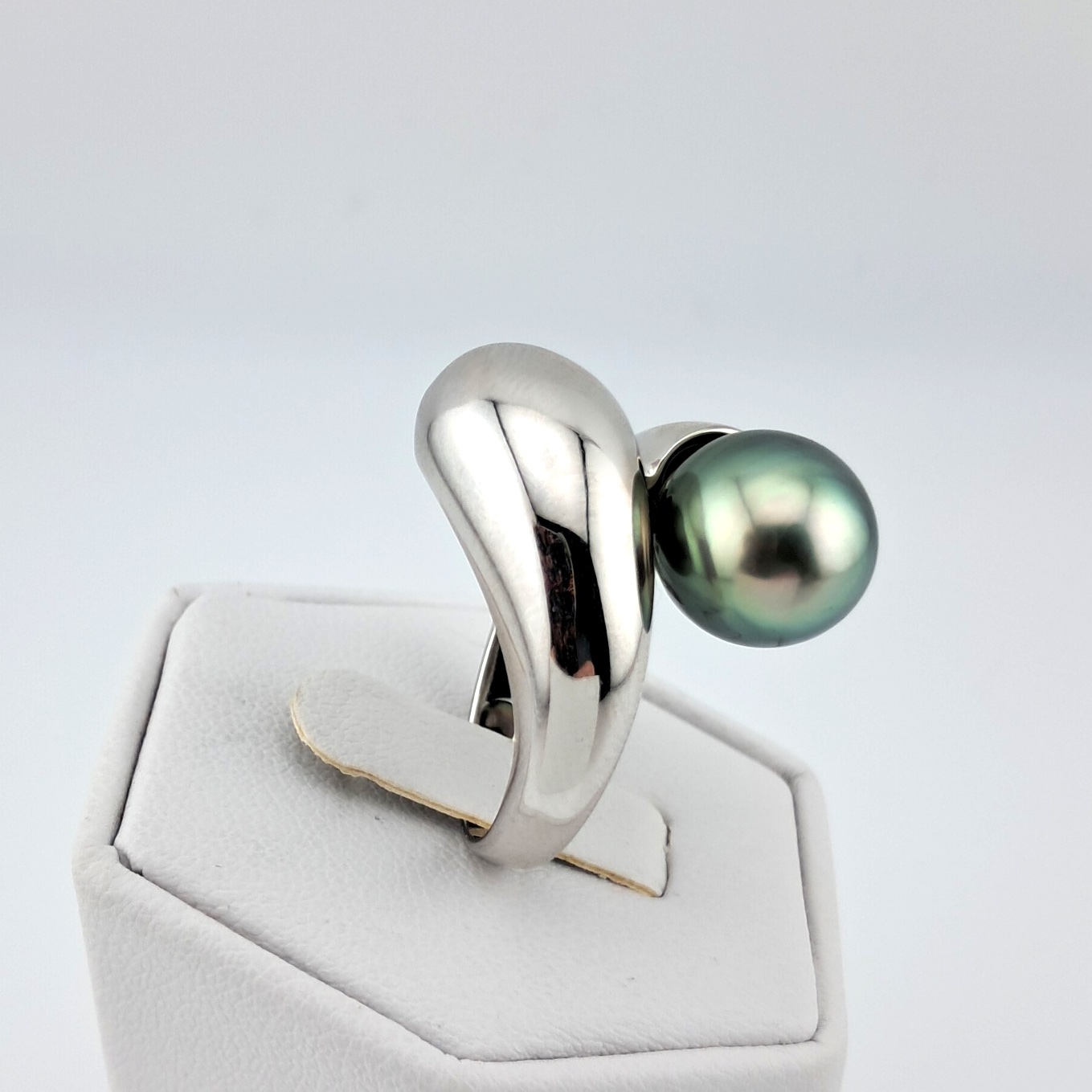La bague “Lady G.” met à l’honneur une superbe perle de Tahiti en forme de goutte, dont l’éclat naturel attire immédiatement le regard. Sa teinte vert clair, délicatement nuancée de reflets irisés, capte la lumière avec élégance et subtilité. D’une belle qualité, cette perle séduit par sa surface soignée et son lustre lumineux, offrant un charme à la fois raffiné et authentique.
