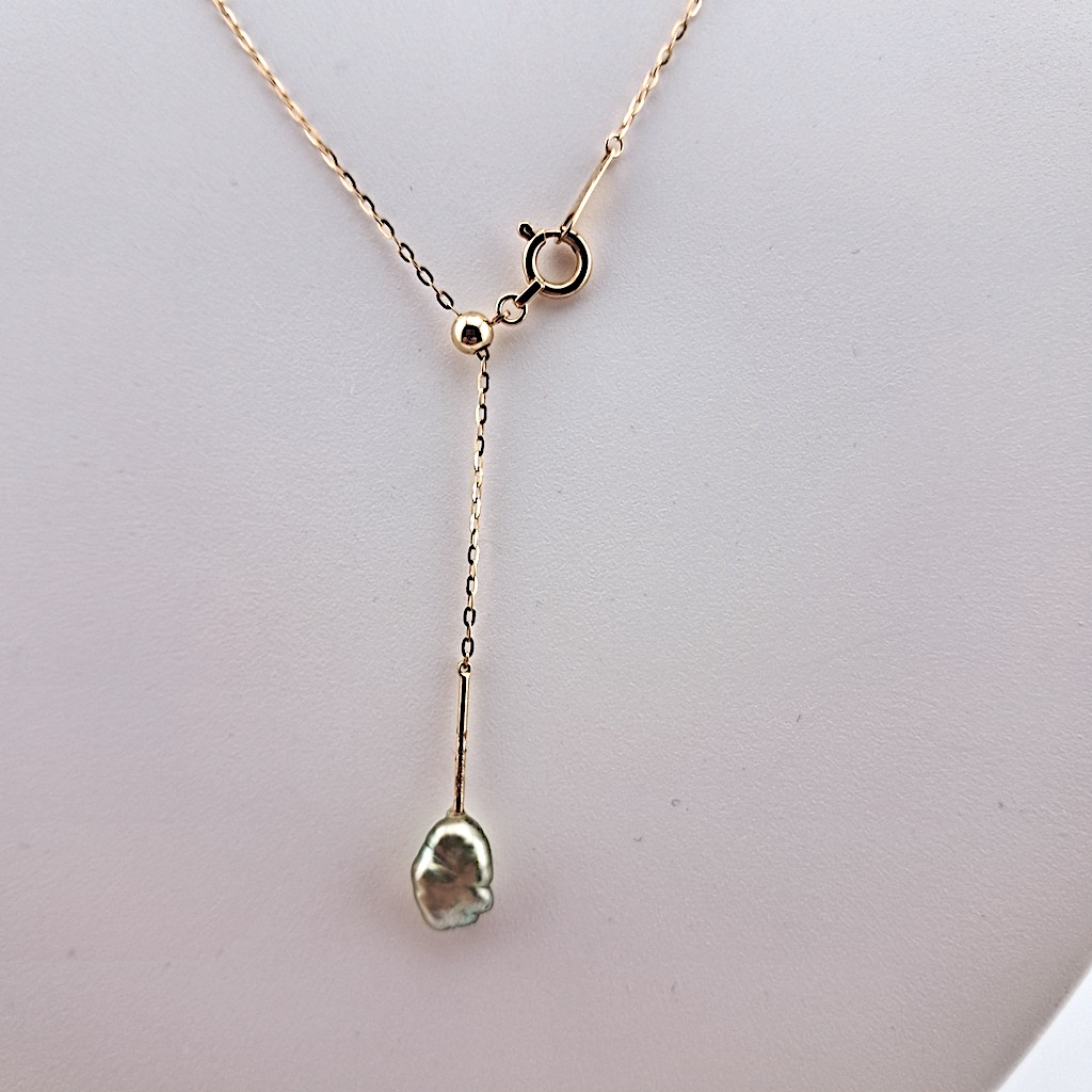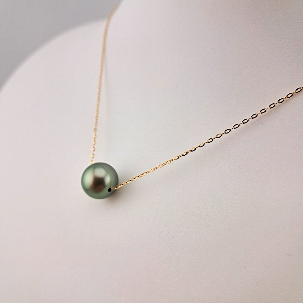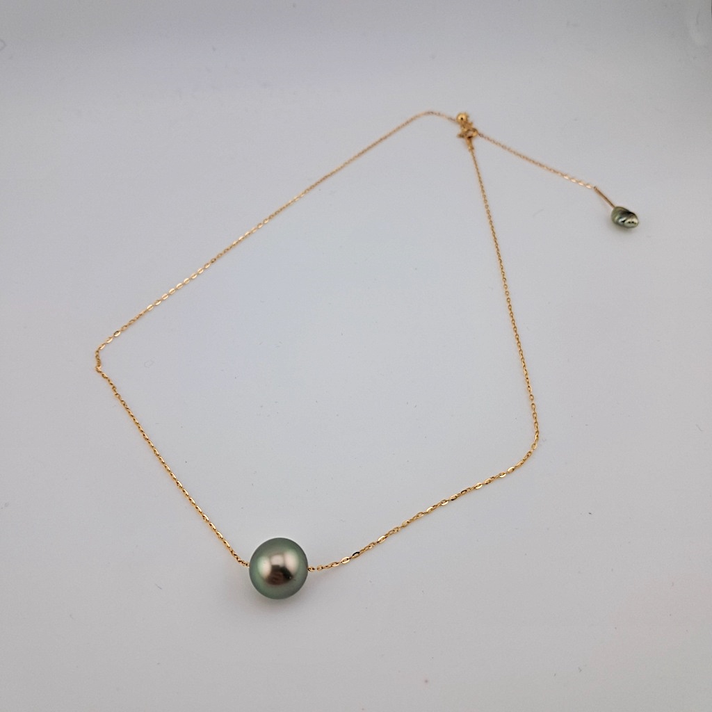 Collier en or jaune 18 carats, chaîne ajustable traversante, 1 perle de Tahiti ronde, catégorie A, 9.7mm, vert doré, terminaison avec 1 keshi de Tahiti vert doré
