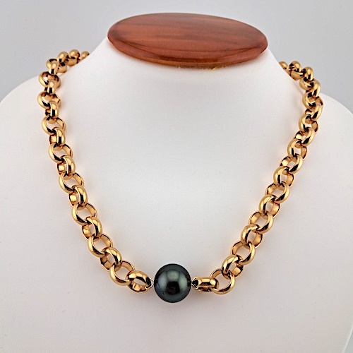 Collier en chaîne plaqué or mailles rondes, 1 perle de Tahiti ronde, catégorie C, 13.9mm, vert foncé