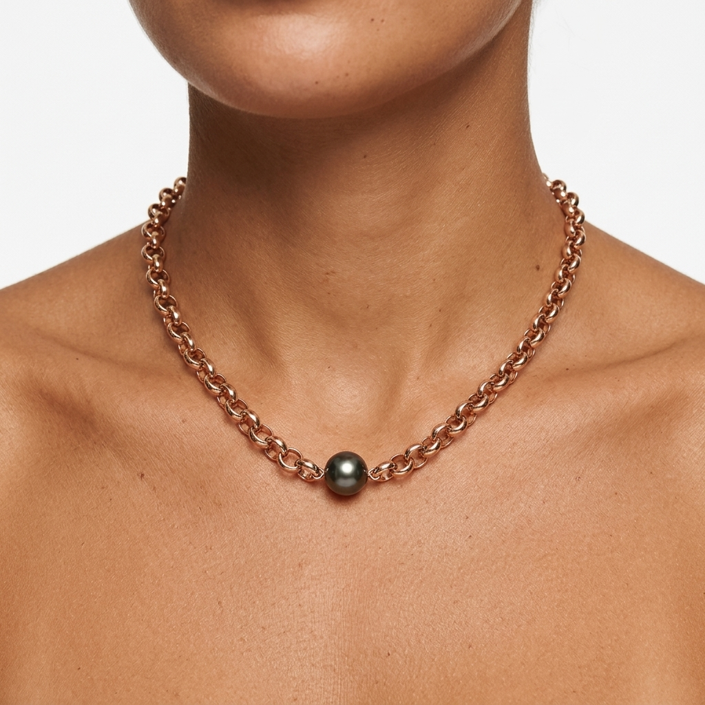 Ce collier met en valeur une généreuse perle de Tahiti d’un vert foncé profond au lustre naturel et aux reflets intenses. Sa rondeur parfaite et son éclat subtil captent la lumière avec élégance, faisant de ce bijou une pièce raffinée et intemporelle qui sublime le décolleté.