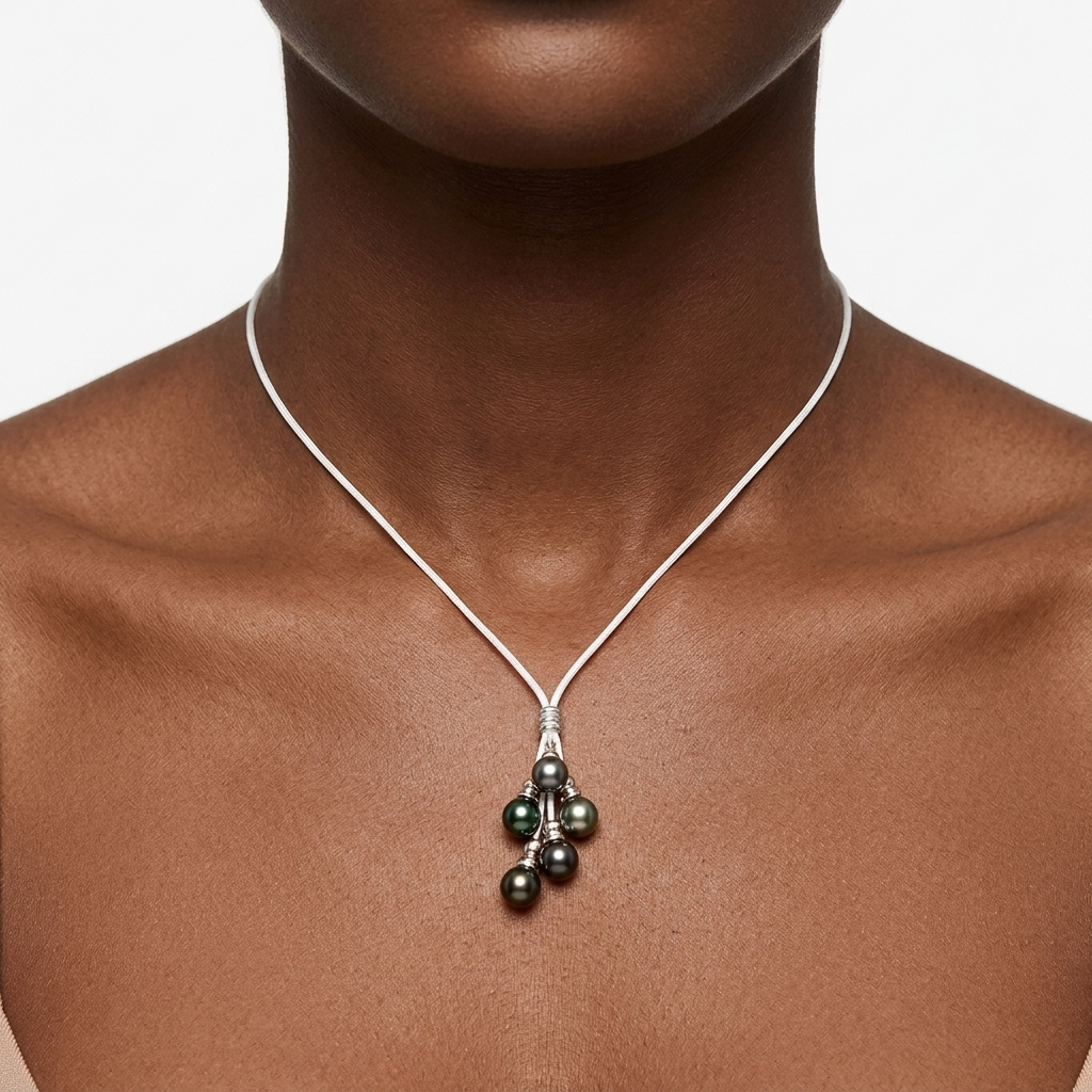 Le collier “Grappe” révèle toute la richesse des perles de Tahiti dans un camaïeu de couleurs uniques : gris rosé, vert, champagne, aubergine et vert cuivré. Chaque perle, aux reflets subtils et au lustre naturel, apporte du mouvement et de la lumière, créant un bijou contemporain, original et élégant rehaussé par l’authenticité du cuir.