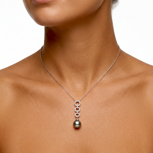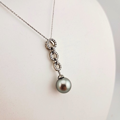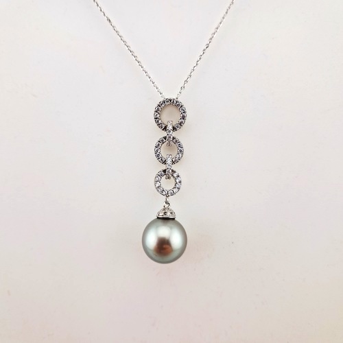 Ce pendentif en argent 925 rhodié sublime une perle de Tahiti ronde gris anisé, dont le lustre délicat et les reflets subtils captent la lumière avec élégance. Les zircons apportent une touche de scintillement raffinée, faisant de ce bijou une pièce lumineuse et sophistiquée.