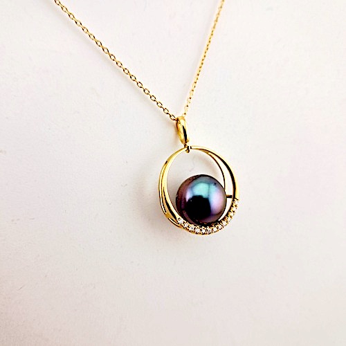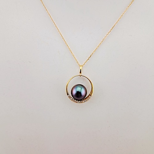 Pendentif en or jaune 18 carats, 13 diamants 0.078 carats GVS, 1 perle de Tahiti ronde, catégorie B, 9.3mm, bleu aubergine