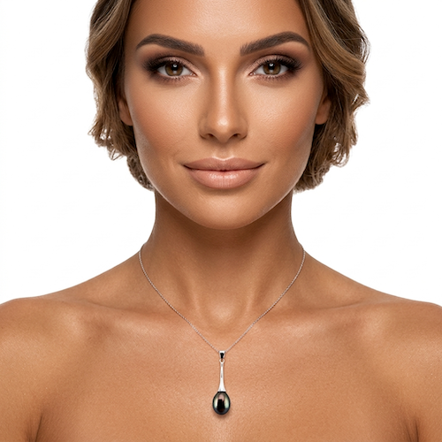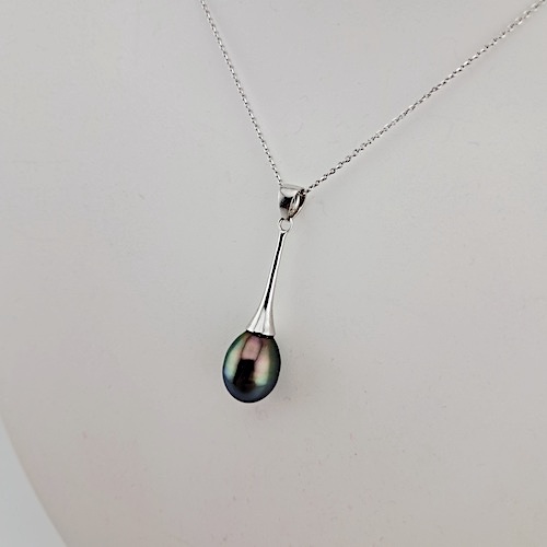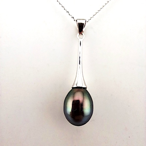 Pendentif ‘grand cône’ en argent 925 rhodié, 1 perle de Tahiti, forme goutte, catégorie A, 10mm, peacock foncé